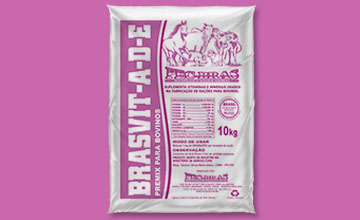 premix vitaminico de vitaminas a-d-esuprir carências de vitaminas a-d-e aumentando o índice de fertilidade e fecundidade e produção geral, auxilia na fixação do cálcio e fósforo, previne o raquitismo, as vitaminas que compõe o brasvit a-d-e estão estabilizadas em forma de palmitato de gelatina só serão destruidas fora do organismo por um calor acima de 90 graus ou no organismo do animal.